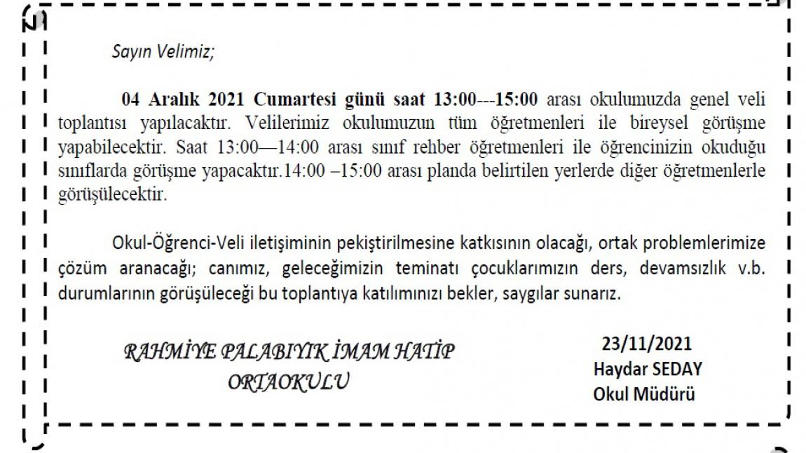 Okul-Öğrenci-Veli iletişiminin pekiştirilmesine katkısının olacağı, ortak problemlerimize çözüm aranacağı; canımız, geleceğimizin teminatı çocuklarımızın ders, devamsızlık v.b. durumlarının görüşüleceği bu toplantıya katılımınızı bekler, saygılar sunarız.